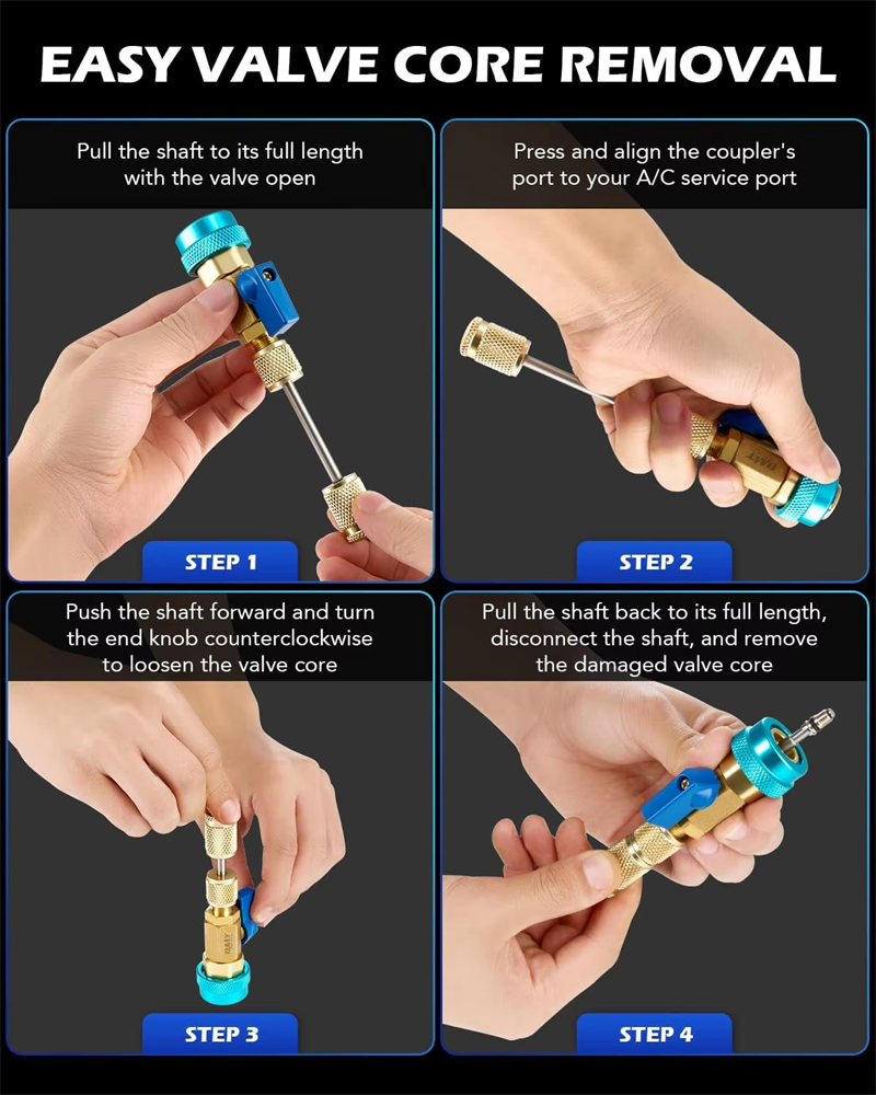 can be removed through the use of this tool. In the process of removing, the refrigerant in the air conditioner will not leak as