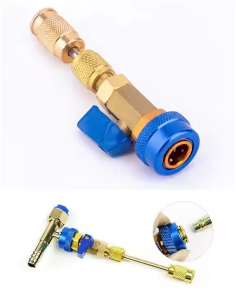 the valve lever on this tool is closed, and it is unnecessary to pour the new refrigerant into the air conditioner.